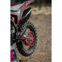 Nouveau montage avec platine renforcée, Sur cette nouvelle 450cc SX CRZ propose une motocross avec moyeux renforcé CNC taillé masse sur des cercles en aluminium de 18" à l'arrière et 21" à l'avant. La roue avant est équipée d'un disque de frein Wave de 260mm mordu par un étrier double pistons et la roue arrière monte un disque de 220mm avec étrier simple piston. Un freinage hydraulique complet évidemment pour répondre à la puissance de ce moteur 450cc . Avec une couronne CNC magnifique 6 trous taillé masse avec platine renforcée et doublée pour une solidité accrue.